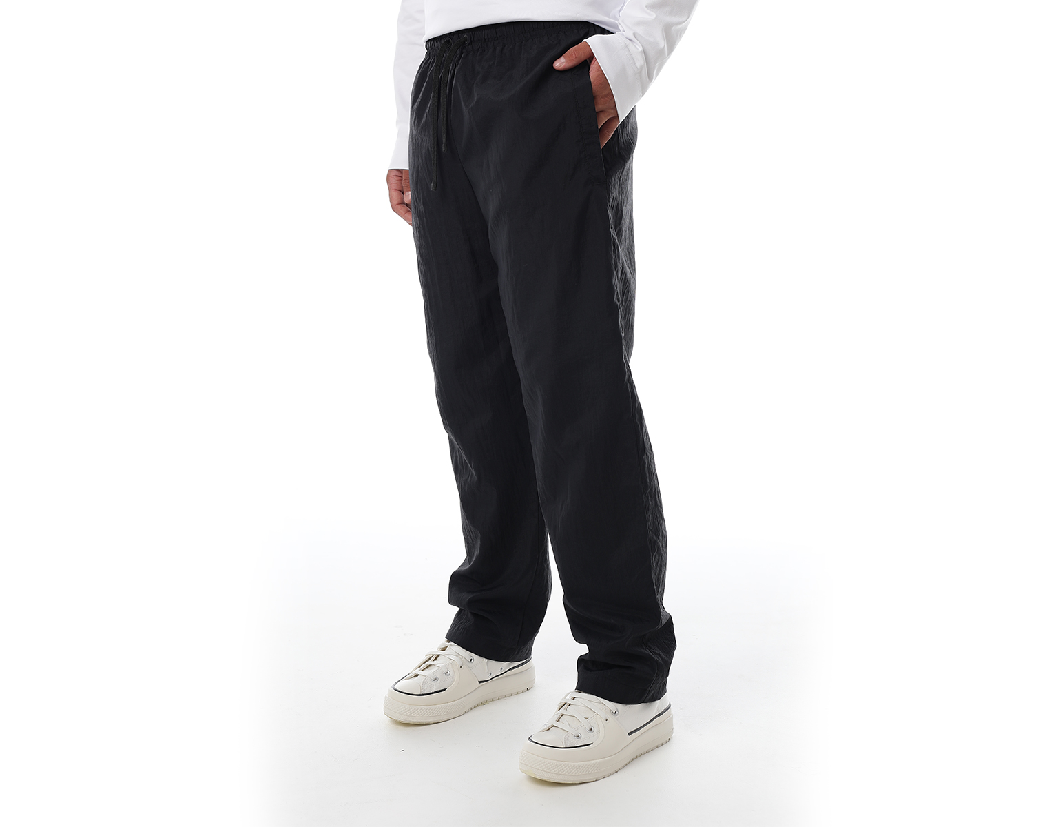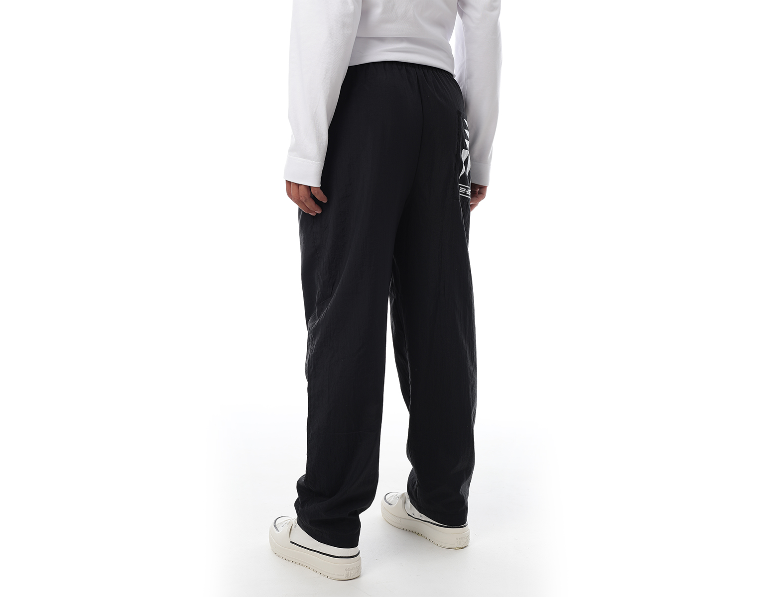 Брюки на эластичном поясе-резинке с боковыми карманами и одним накладным сзади. Модель декорирована печатью в технике DTF. Мидлфит. Черные. Состав: 75% полиамид, 25% переработанный полиамид. 96 грамм.