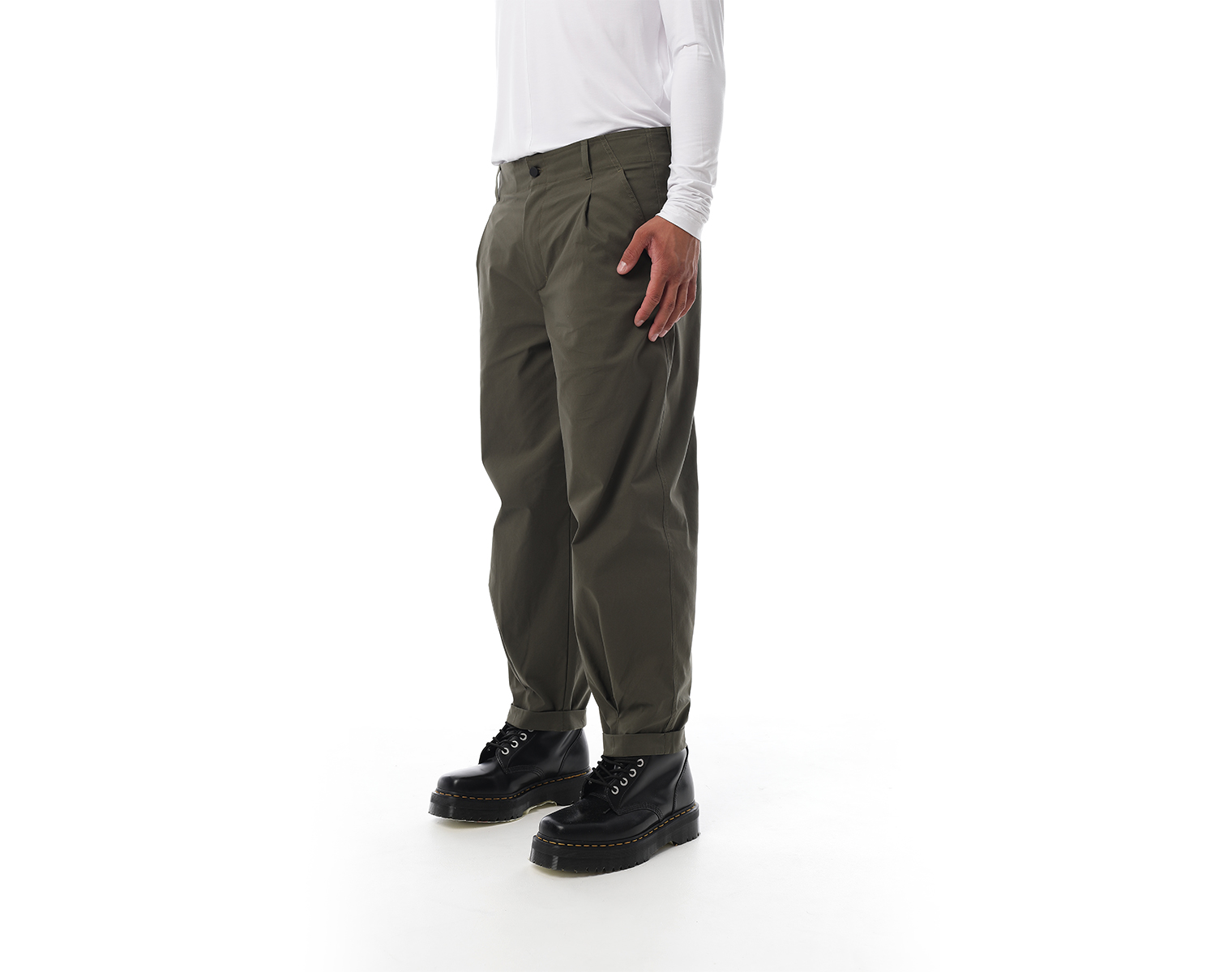 Брюки "карго" на поясе и застежкой на молнии спереди, с двумя боковыми карманами и одним накладным сзади, внизу брючины оформлены на защипах с фиксированным подворотом. Мидлфит. Хаки. Состав ткани: 100% хлопок, 220 грамм.