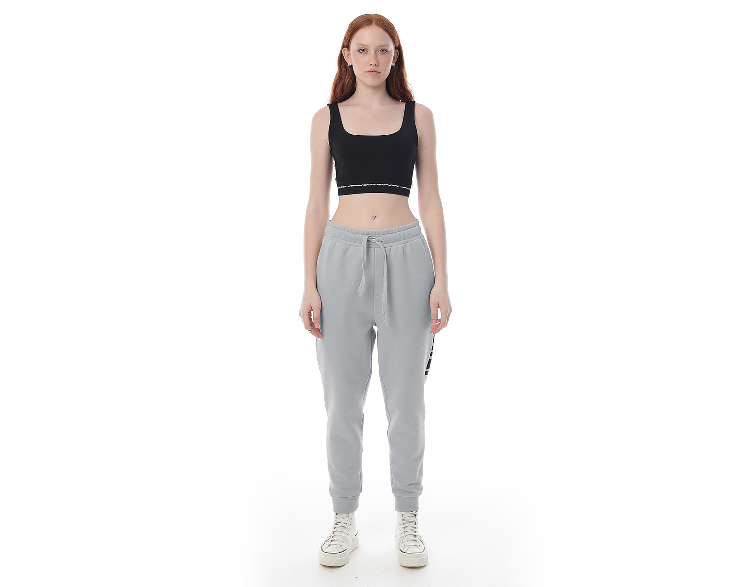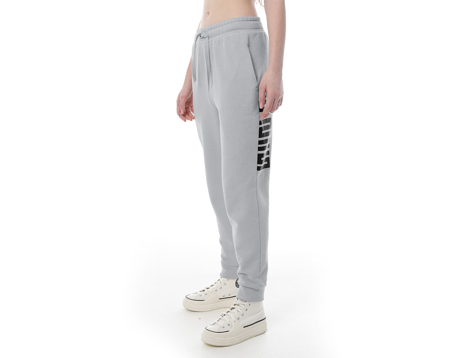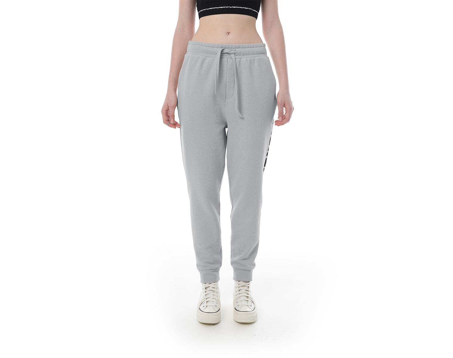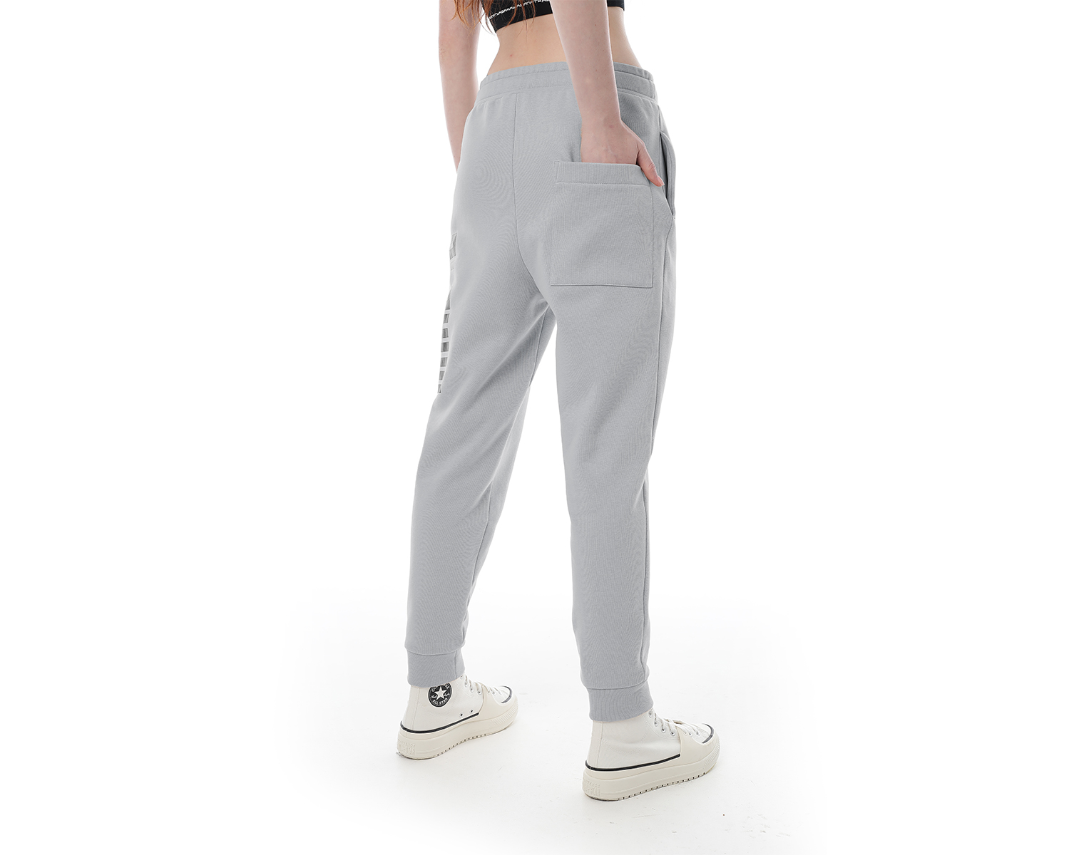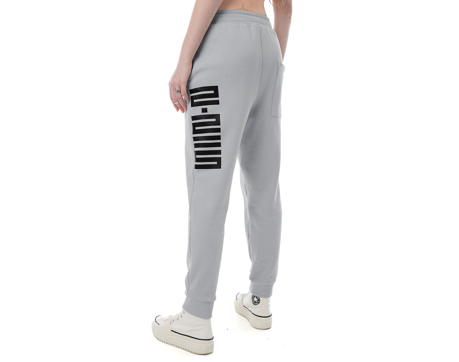 Трикотажные брюки-джоггеры на эластичном поясе-резинке и накладным карманом сзади. Серый меланж. Модель декорирована печатью в технике DTF. Мидлфит. 100% хлопок, 380 грамм.