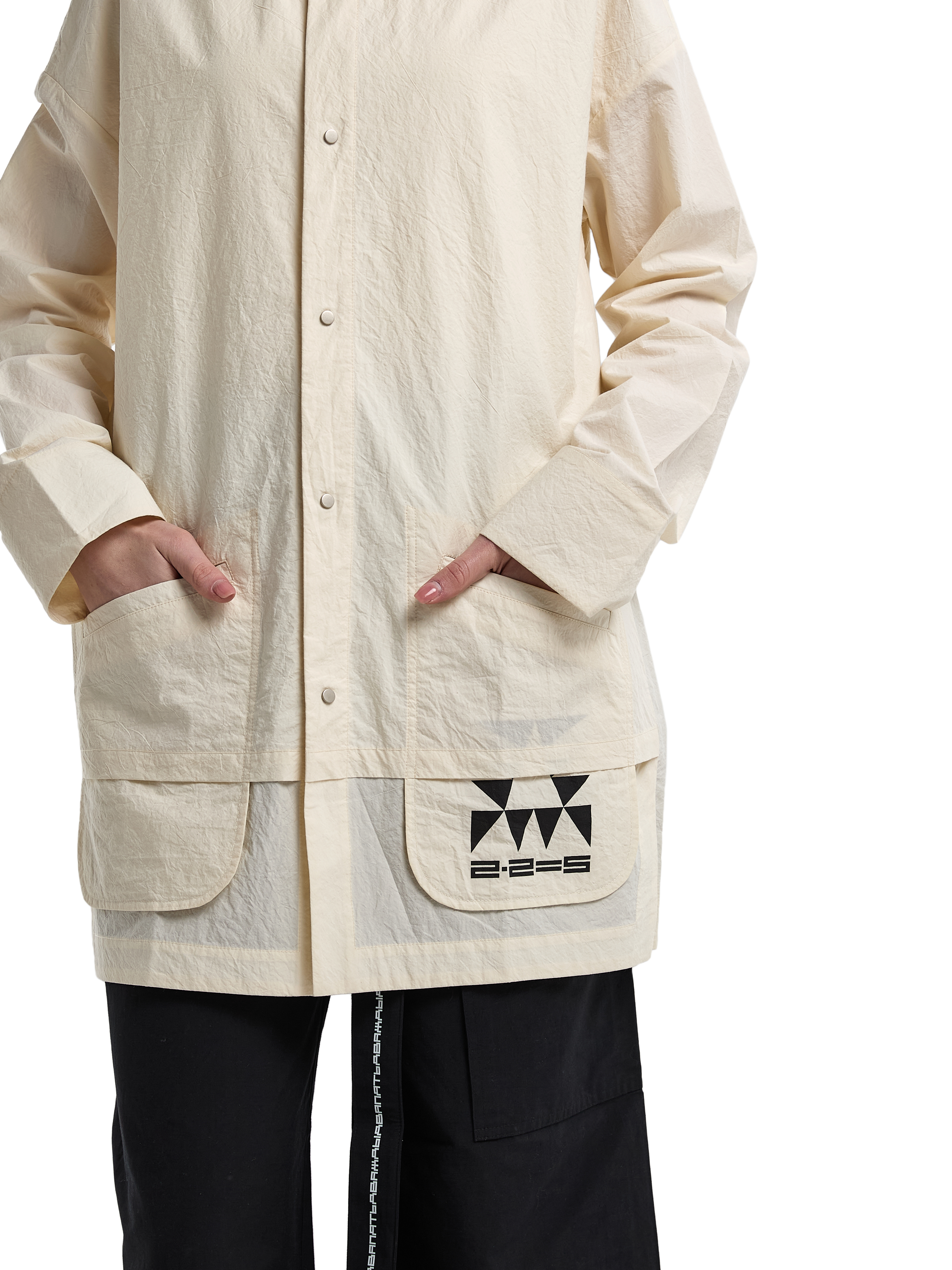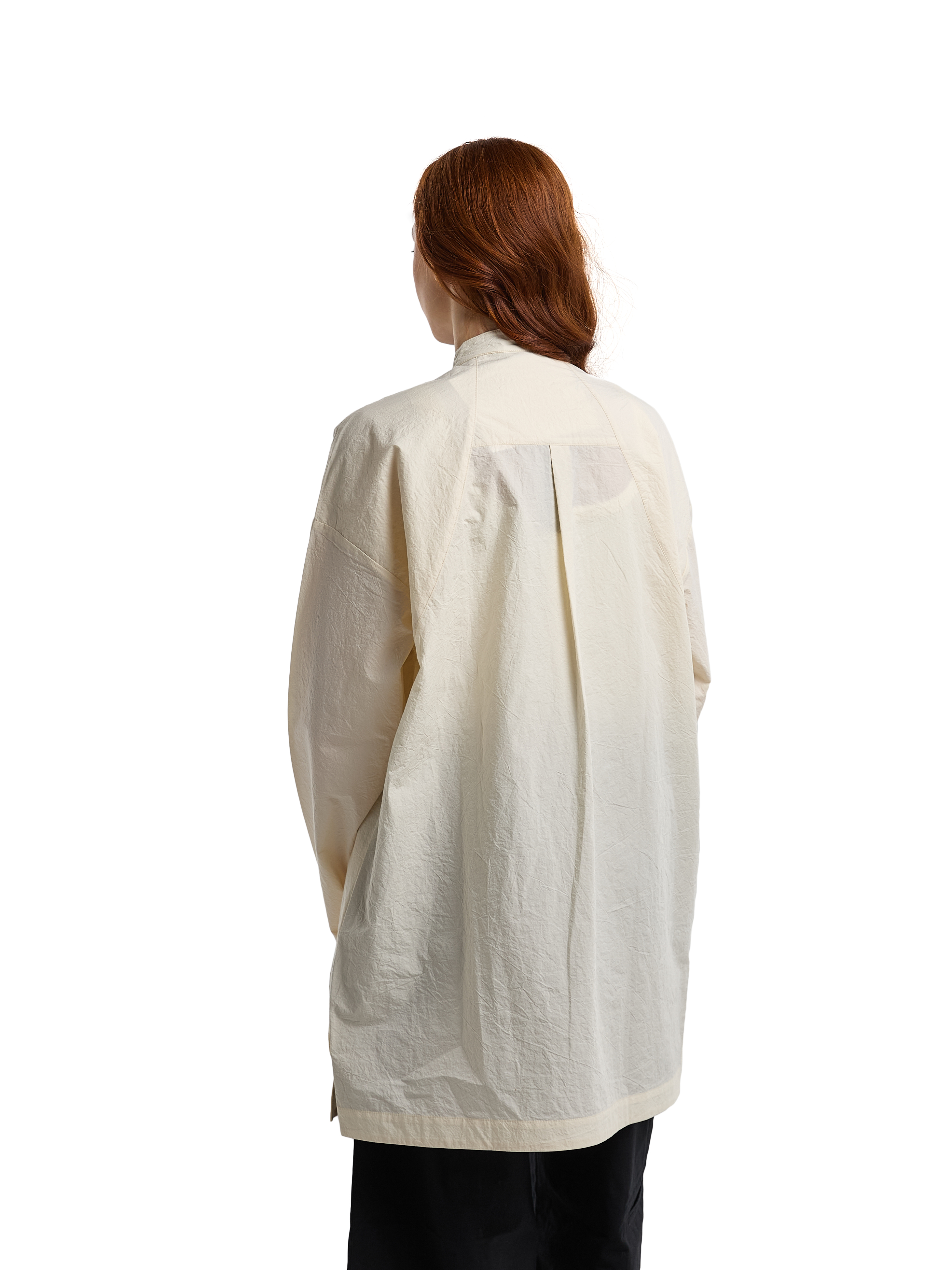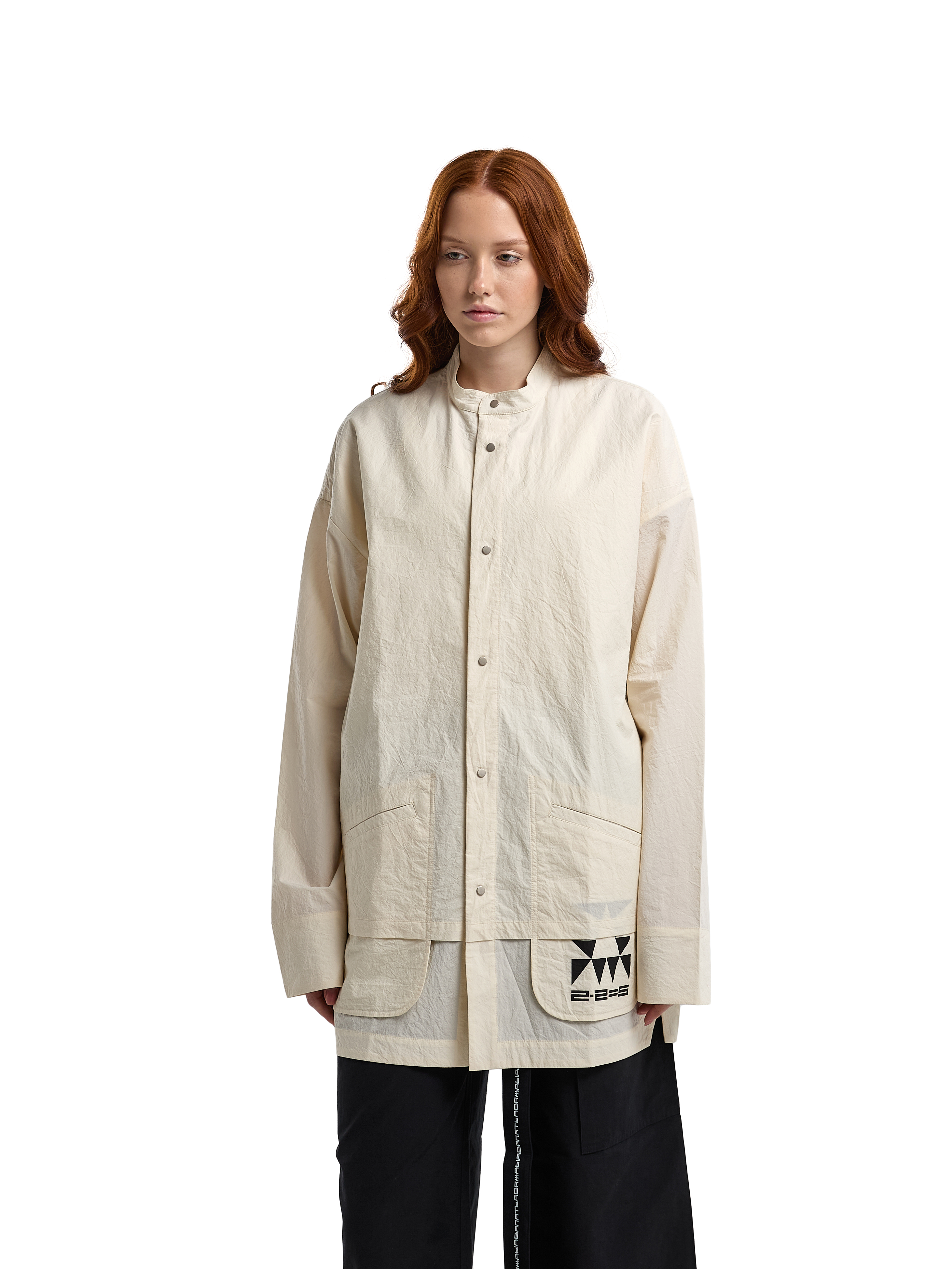 Рубашка с длинными рукавами на манжете, с двумя прорезными карманами спереди. Кремовая. Мидлфит. Модель декорирована печатью в технике "шелкография". Состав: 100% хлопок с "crash" эффектом, плотность 170 грамм.