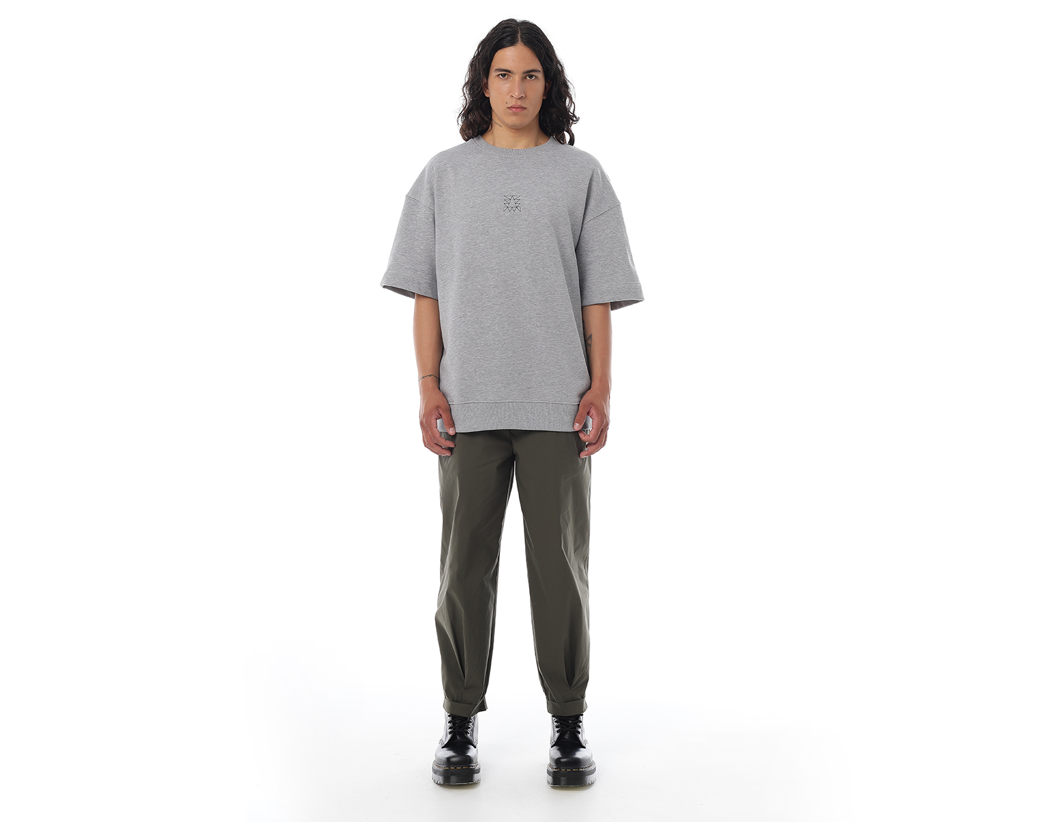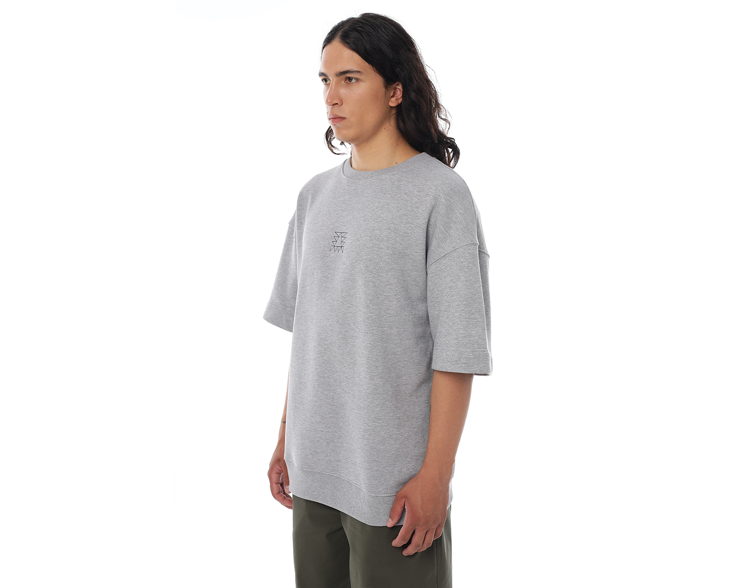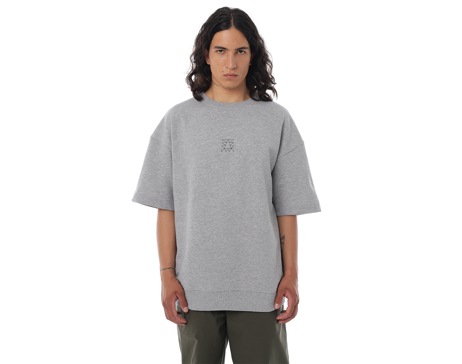 Свитшот с коротким рукавом. Светло-серый меланж. Посадка мидлфит. Футер 60% хлопок 40% полиэстер, плотность 350 грамм. Модель декорирована вышивкой в виде буквы "Д" и на спинке печатью в технике DTF.